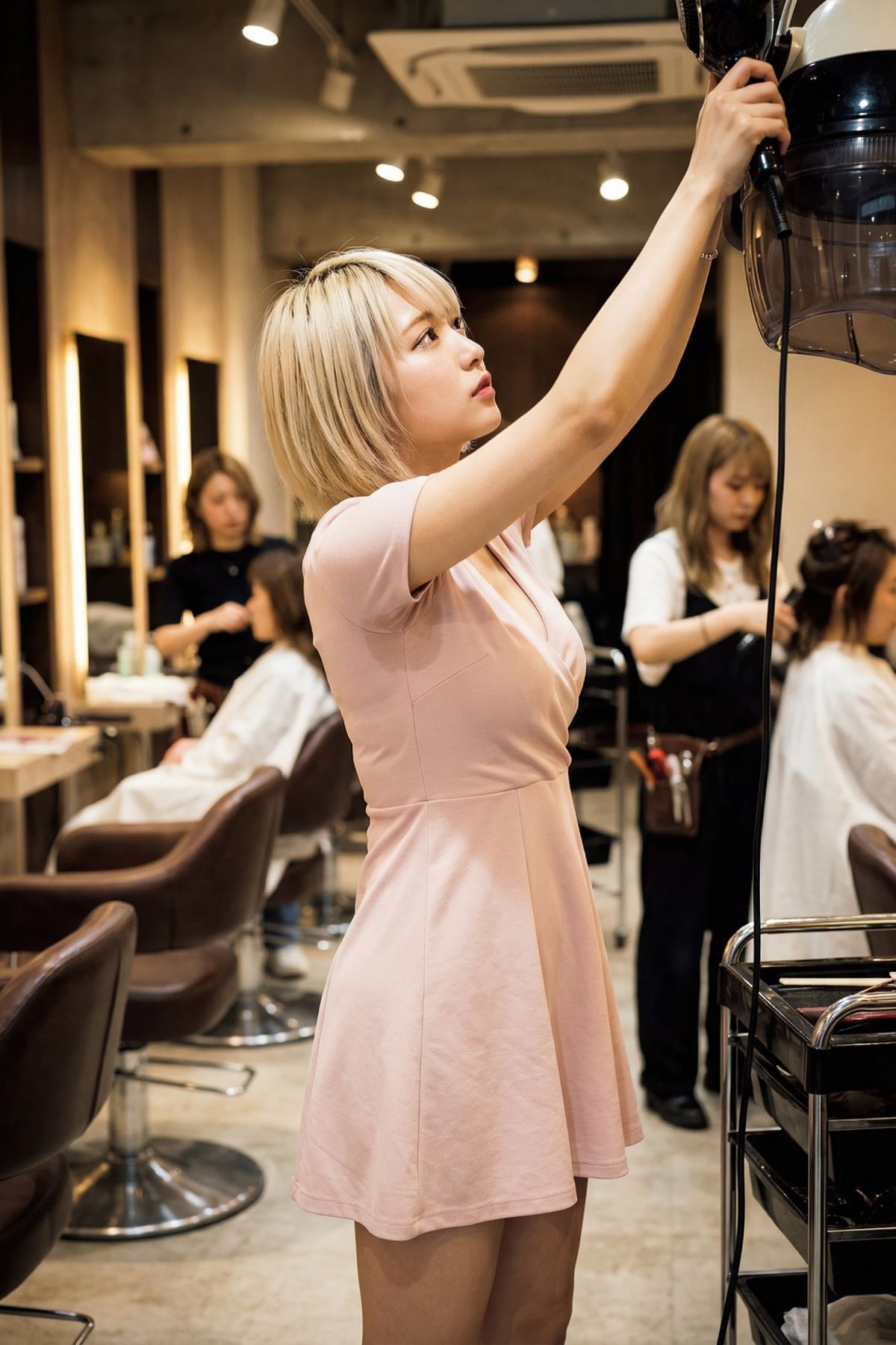 美容師らしいスタイリッシュなファッションのミニスカートの裾から「時々」こぼれてしまう下着。それは、真剣に働く彼女たちだからこそ生まれる、計算のない美しさです。